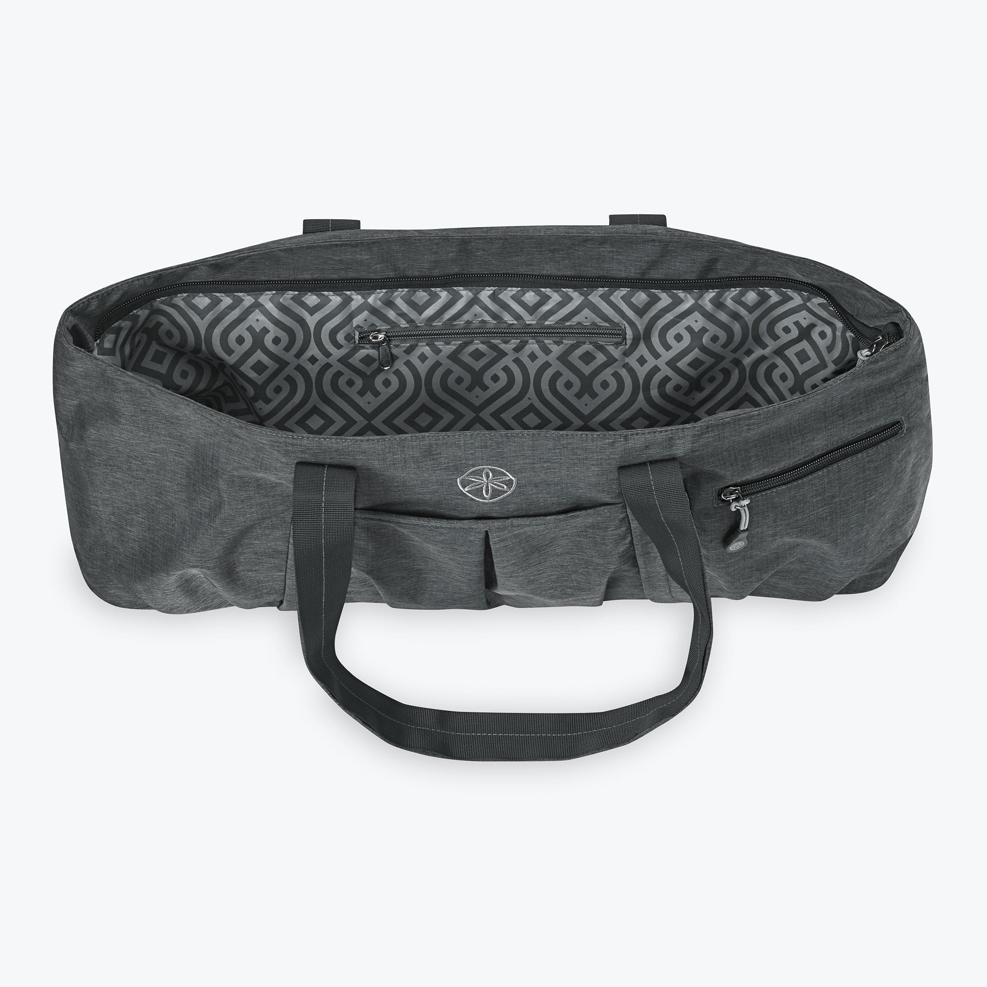 Fit all your gear, plus your mat, with this All Day Yoga Tote. This large bag features a main compartment, a side pocket designed to securely hold your mat, and inner and outer small zip pockets to keep your essentials safe. This bag also features a comfortable, reinforced, carry strap and an interior easy-to-clean fashion print liner.