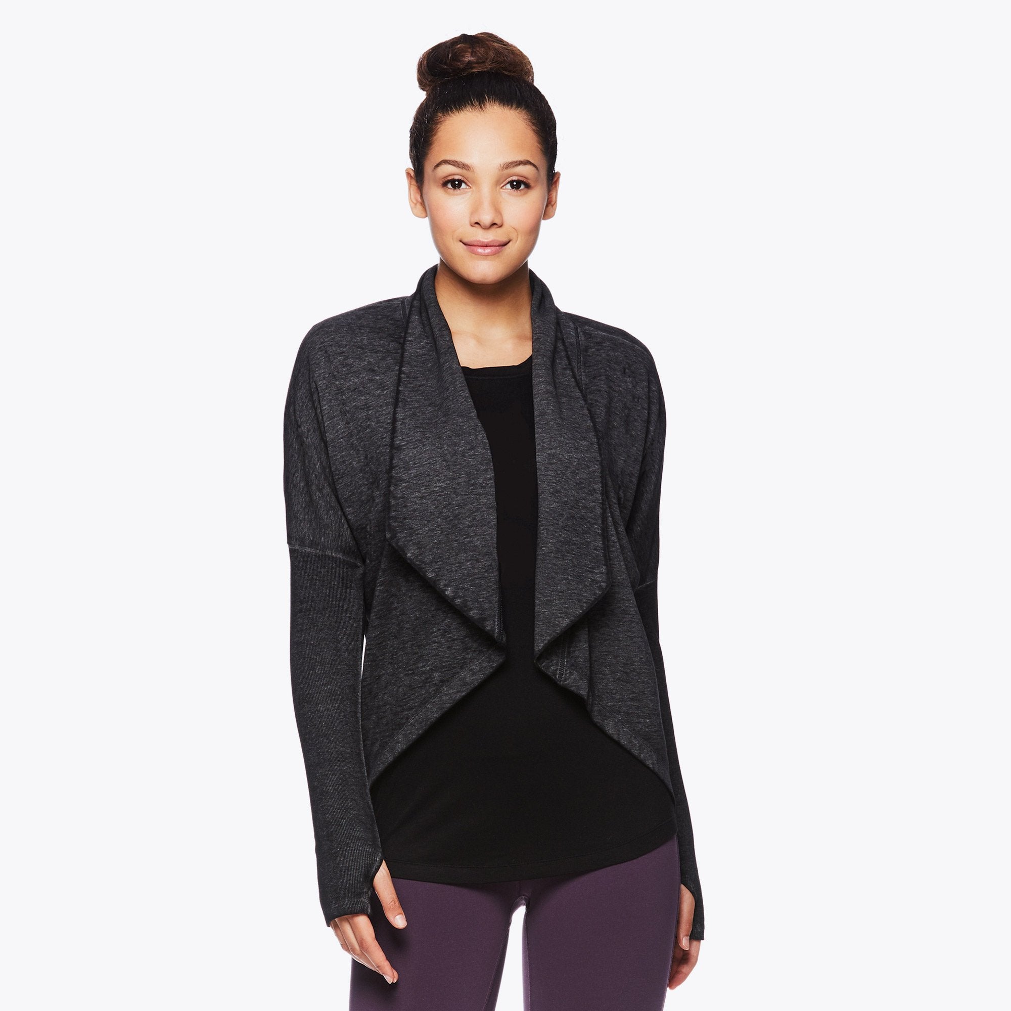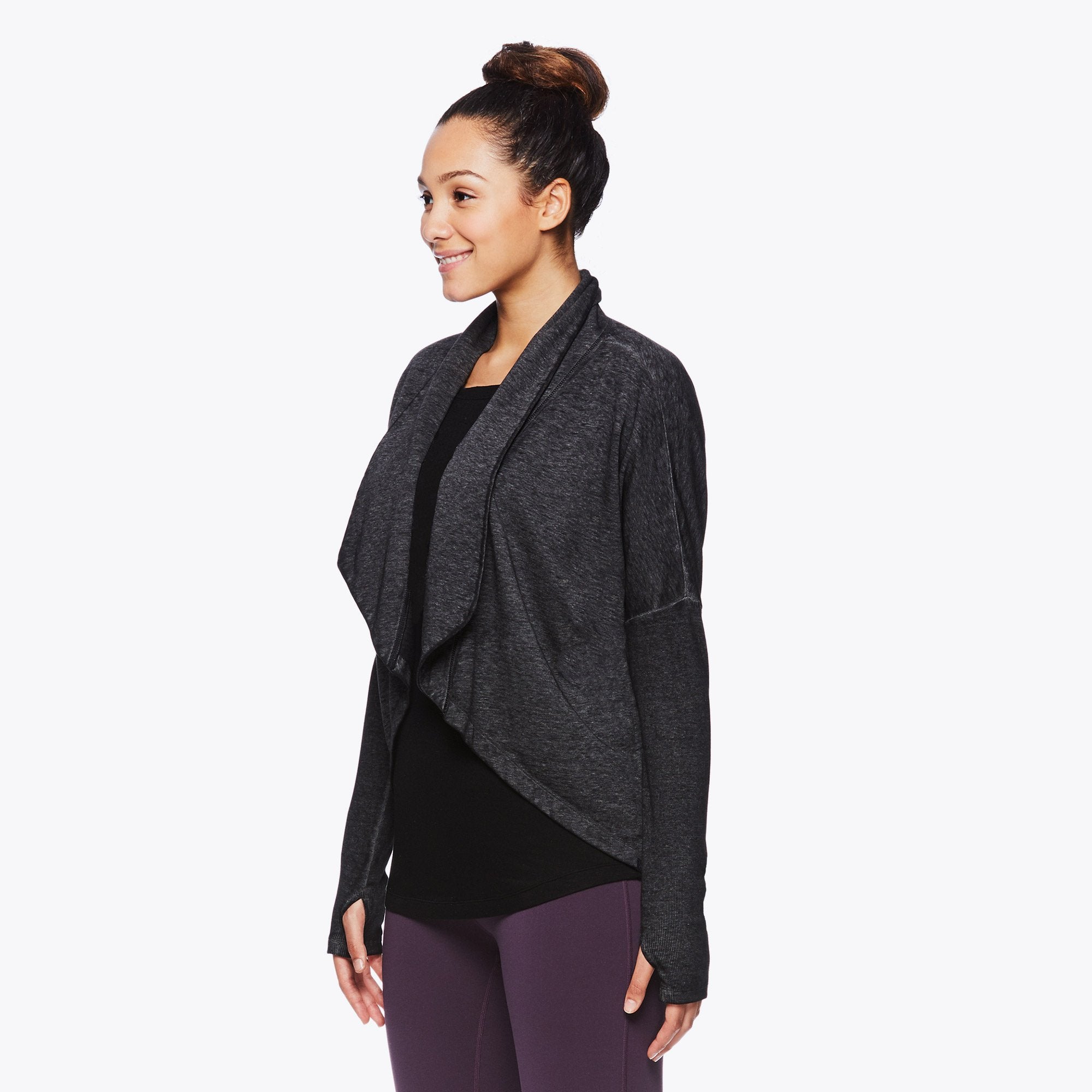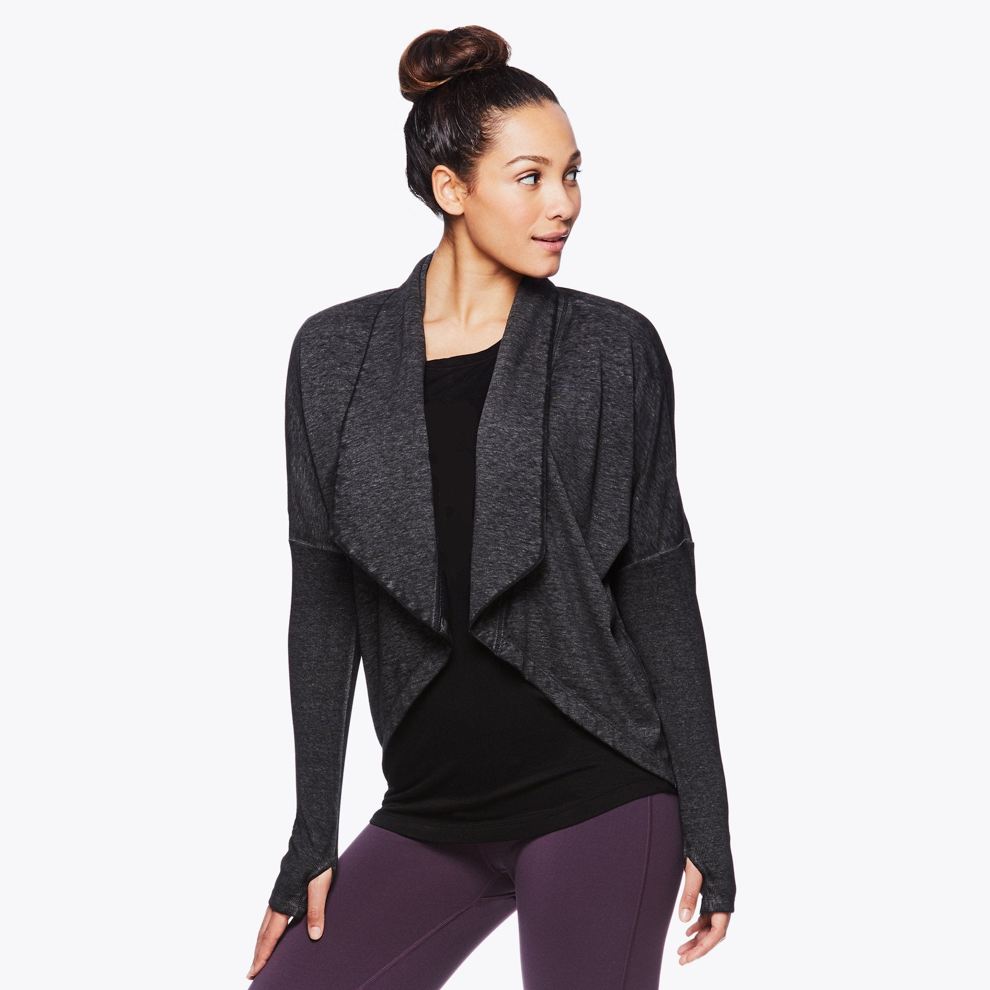 Layer up, and do it with style, with the Calla Wrap. Designed for the coziest comfort, this top is made from soft-touch fabric, and features long sleeves, thumbholes, ribbed textures and a flowy cropped figure-flattering length in the front for shape and style. Easily layer over any top and head straight from the studio to the streets in comfort and style.